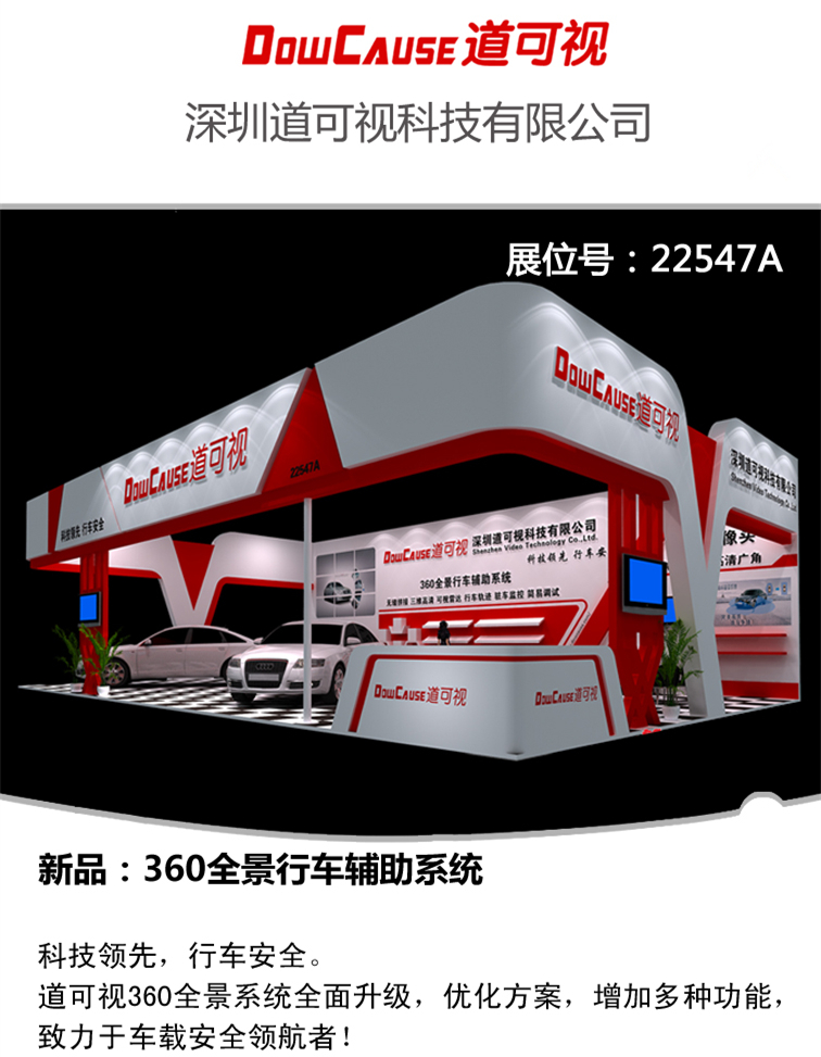 2015年1月16日,第十一屆深圳國際汽車改裝服務(wù)業(yè)展覽會盛大開幕,迎來了國內(nèi)各地的參展商和采購商。深圳道可視科技有限公司精心準備的各種展品在展會現(xiàn)場獲得了市民以及采購商的一致好評。特別是我們的360度全景泊車影像系統(tǒng)備受關(guān)注,受到了各界人士的駐足。這一次我們主要的展品有360度全景泊車影像系統(tǒng)、智能倒車軌跡、專車專用攝像頭。這三類展品是我們公司專門針對汽車電子行業(yè)設(shè)計生產(chǎn)的主打產(chǎn)品,不僅在國內(nèi)屬于獨創(chuàng),在國際上也是具有較強競爭力。