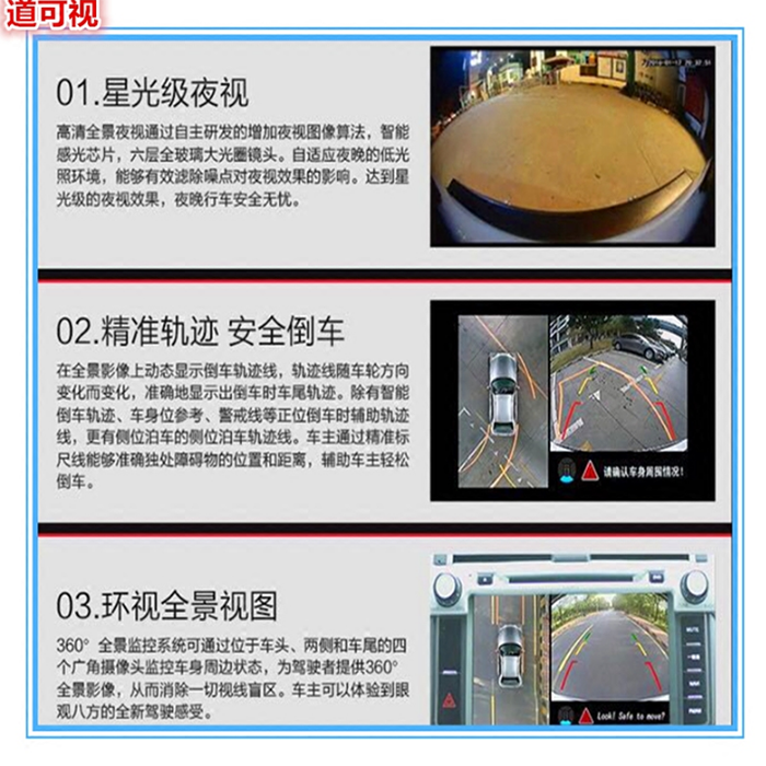 道可視1080P超清版360度全景行車輔助系統(tǒng)擁有更高的清晰度;軌跡線誤差小于5厘米;6大行車輔助功能,讓你行車更安全。我想大家不愿意遇到的就是當有些強行變道剮蹭到自己愛車后逃之夭夭,原本以為行車記錄儀可以拍攝到車牌號碼,結果取證時卻發(fā)現(xiàn)只剩一片模糊...分辨率低、夜晚拍攝能力差,取景角度太小這些問題一直都是不正規(guī)行車記錄儀為常見的問題,貪一時便宜有時候損失可是相當大的。