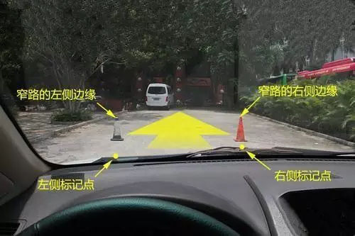 在車子慢慢靠近窄道的過程中,只要不讓兩側(cè)的邊緣在這兩個(gè)點(diǎn)的范圍內(nèi),那就是可以安全通過的。