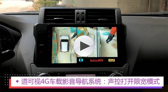 三維限寬模式:在此模式下,車主能輕松直觀的查看車身與障礙物的距離。以道可視推出的搭載了360°全景輔駕的“4G車載影音導(dǎo)航系統(tǒng)”為例,可以通過語音聲控“打開全景”讓中控屏呈現(xiàn)360°全景畫面。在打開全景功能后,再一次發(fā)出“打開全景”的聲控指令,就可以切換到“三維限寬模式”,幫助用戶順利的通過狹窄路段。